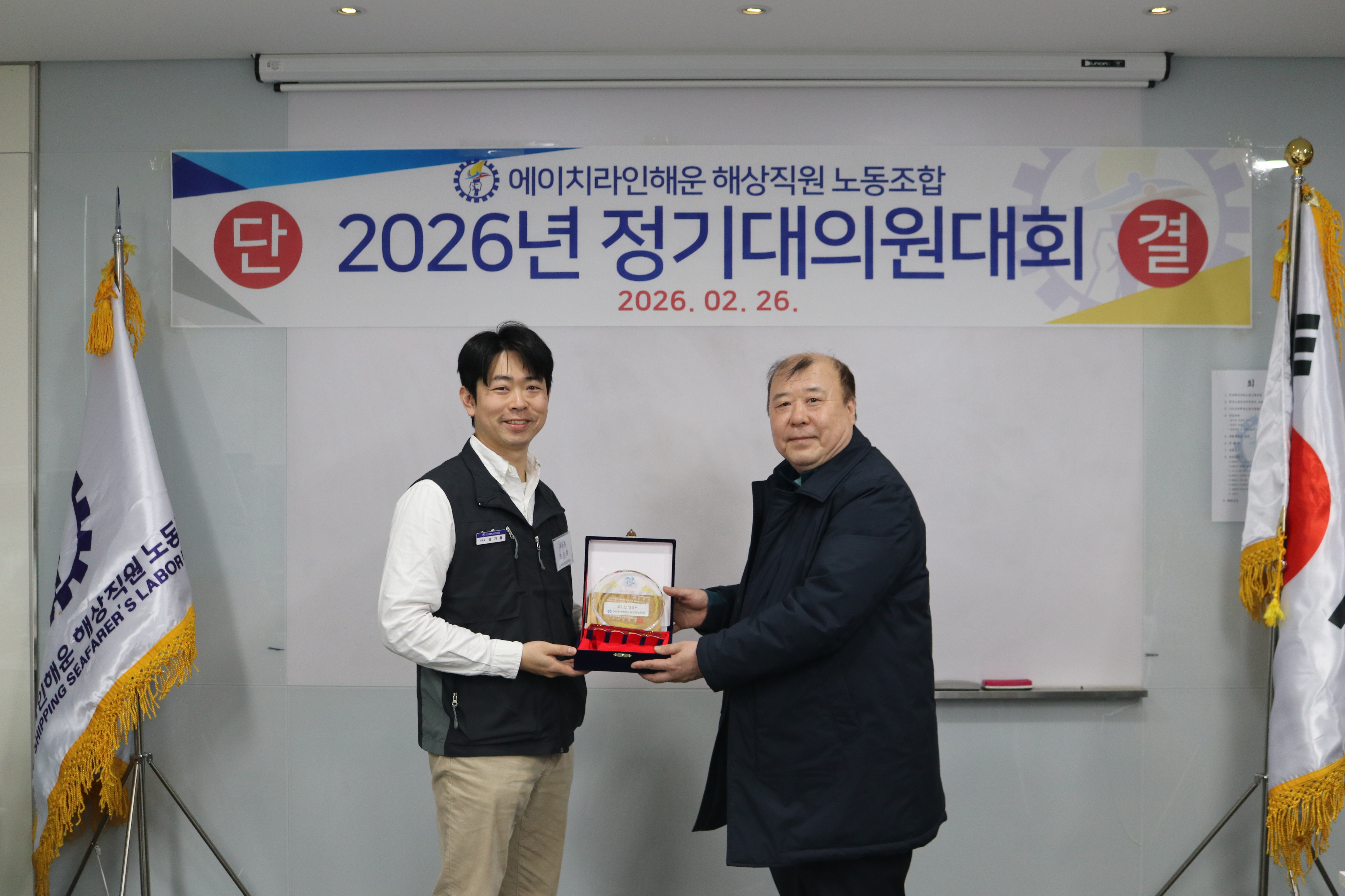 478478 에이치라인해운해상직원노동조합 정기대의원대회 등록일 : 2026.02.26 조회 : 38 회 <에이치라인해운해상직원노동조합 정기대의원대회>일시 : 2026년 2월 26일(목) 15시장소 : 6층 본사 교육장 (중구 대교로 119, CJ대한통운빌딩)